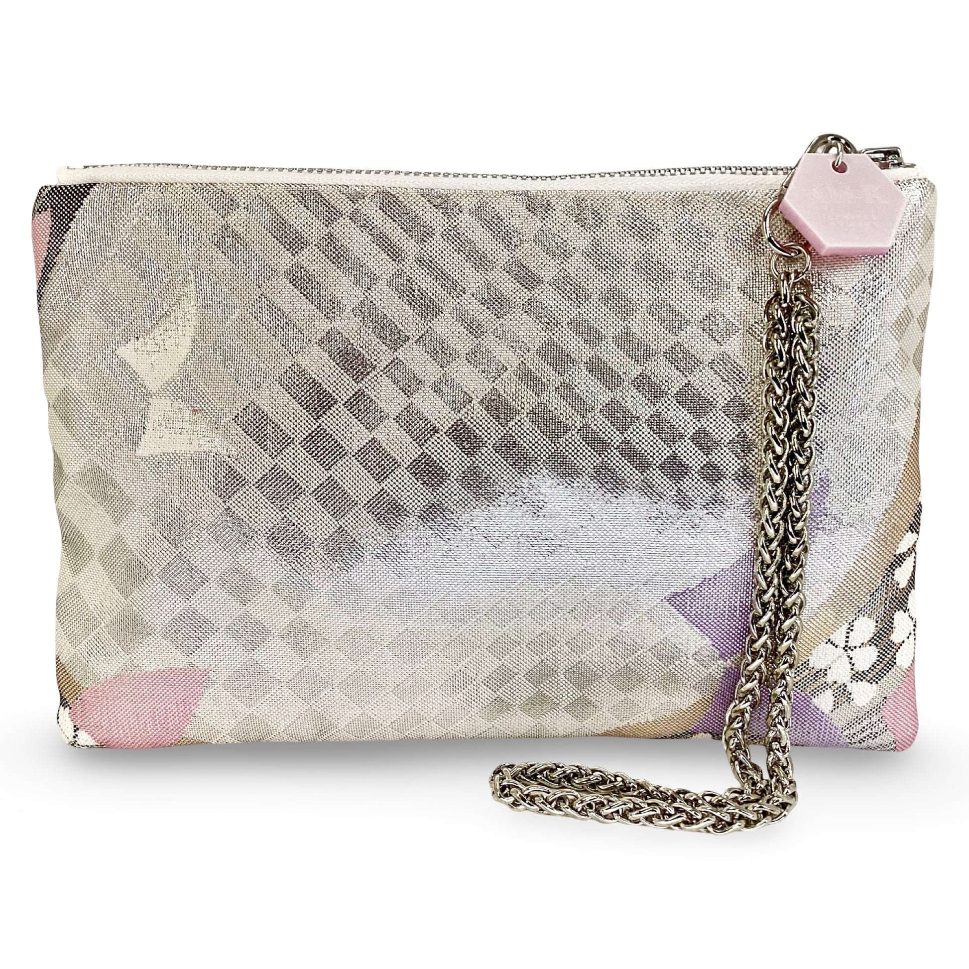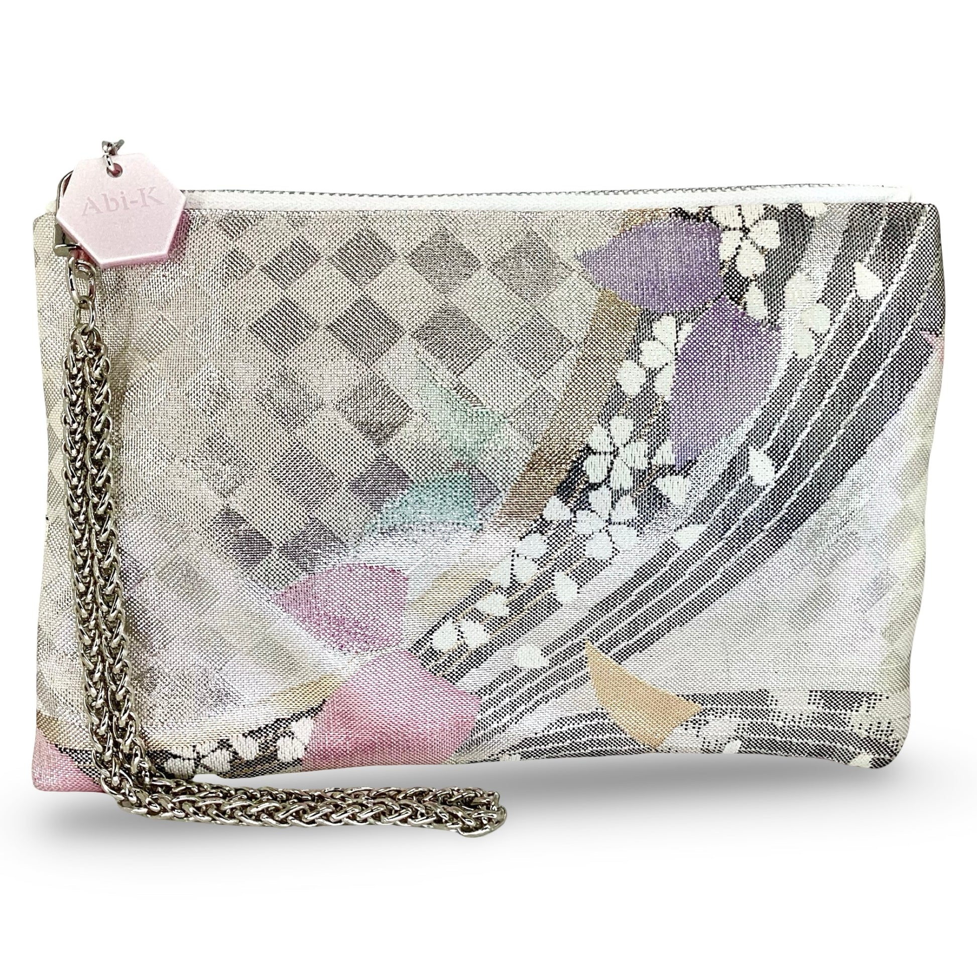 The Carolyn clutch purse is a versatile gem of an accessory, soft structure, perfect for holidays as they pack flat, are lightweight and instantly accessorise a capsule wardrobe with style and impact. Perfect dressed up or down. Fastens with a zip and large enough for all your essentials. Even the lining is made from the back of the original obi. Features a detachable wristlet chain strap and laser etched hexagon button; hexagons are a Japanese symbol of longevity and good fortune, taken from 'Kikko' meaning tortoiseshell.