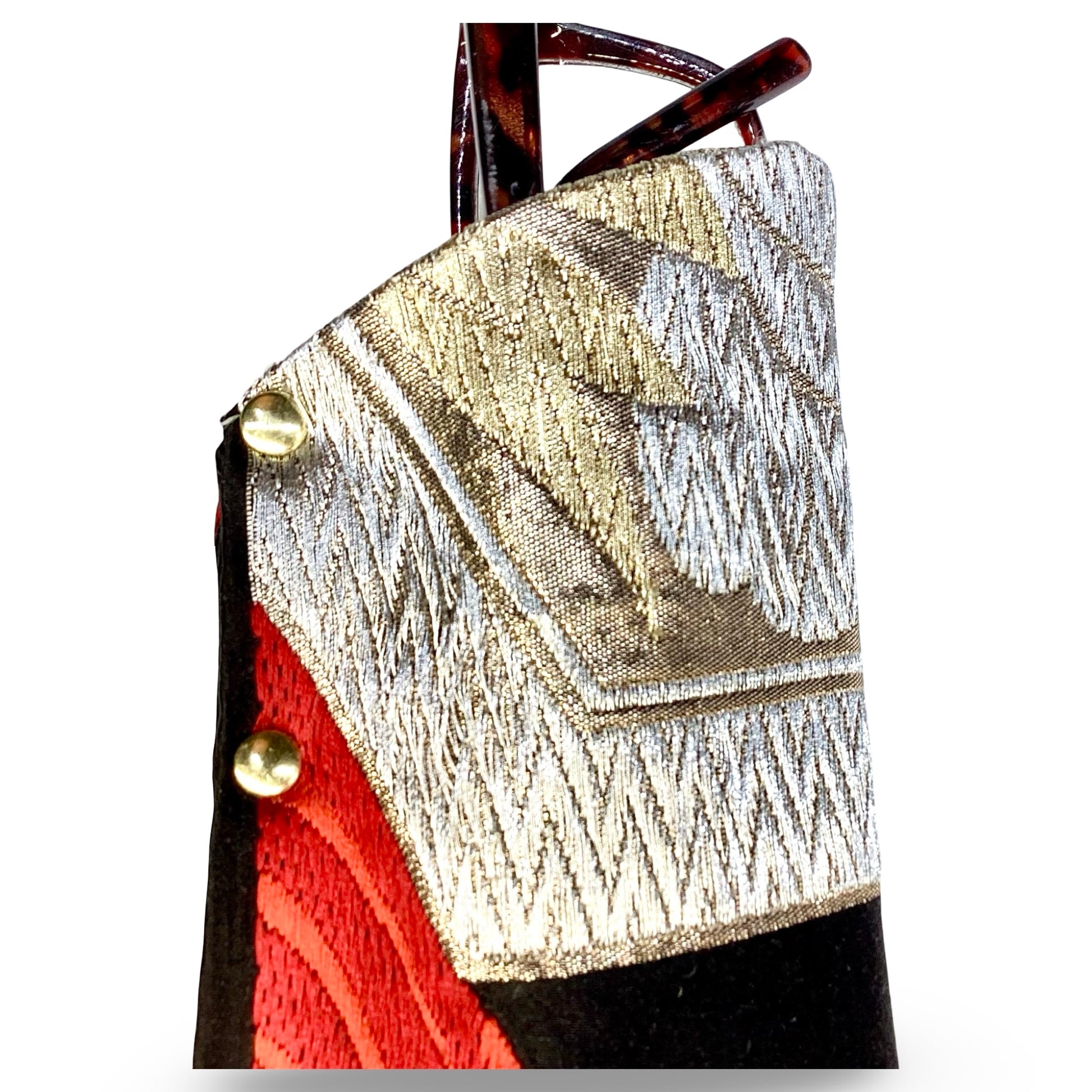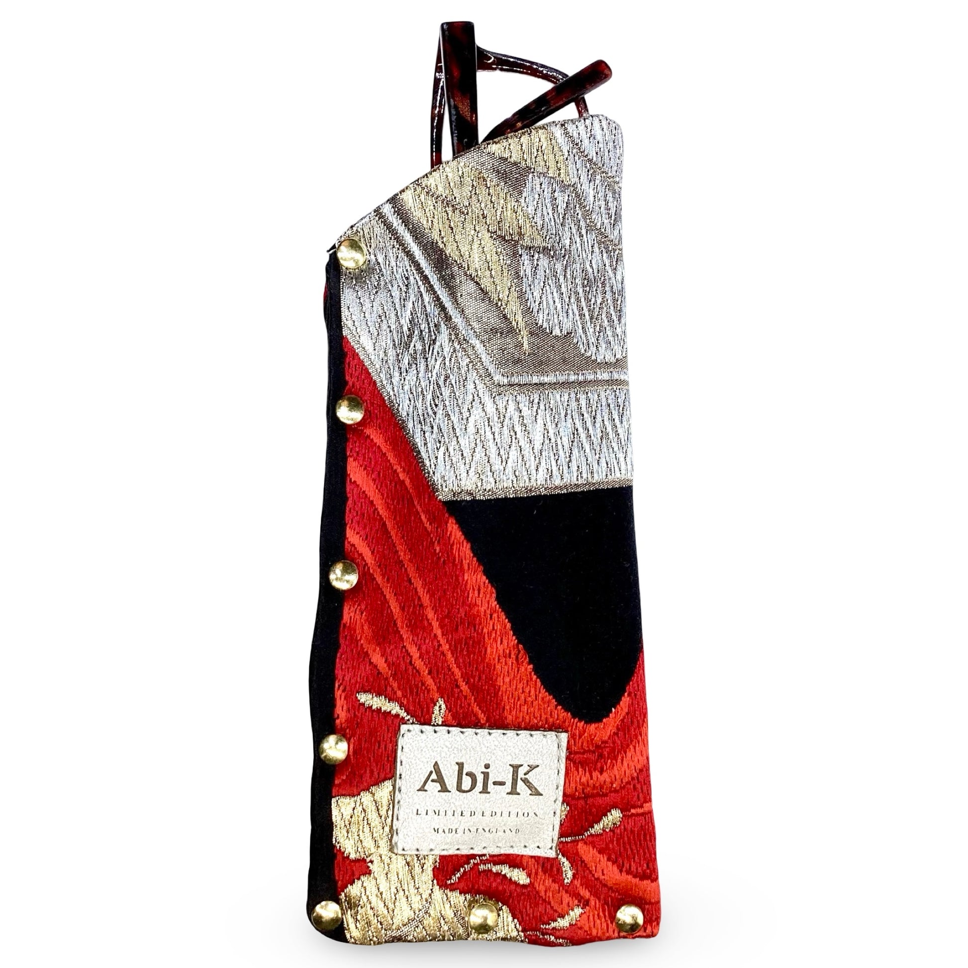 I amunique: Abi-K products are individually hand crafted from vintage Japanese kimono obi silks. The obi is the formal sash worn around the waste of a kimono and were once worn in formal Japanese ceremonies.Hexagonal shapes means 'kikko' (tortoise shell). In Japanese culture this represents 'happiness & longevity' often used in wedding ceremonial attire.